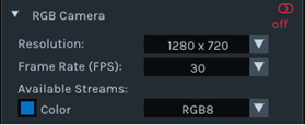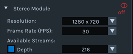 利用可能なストリームで深度を有効にする。(デフォルトで有効になっています)解像度を1280 x 720に、フレームレート(FPS)を30に設定します。